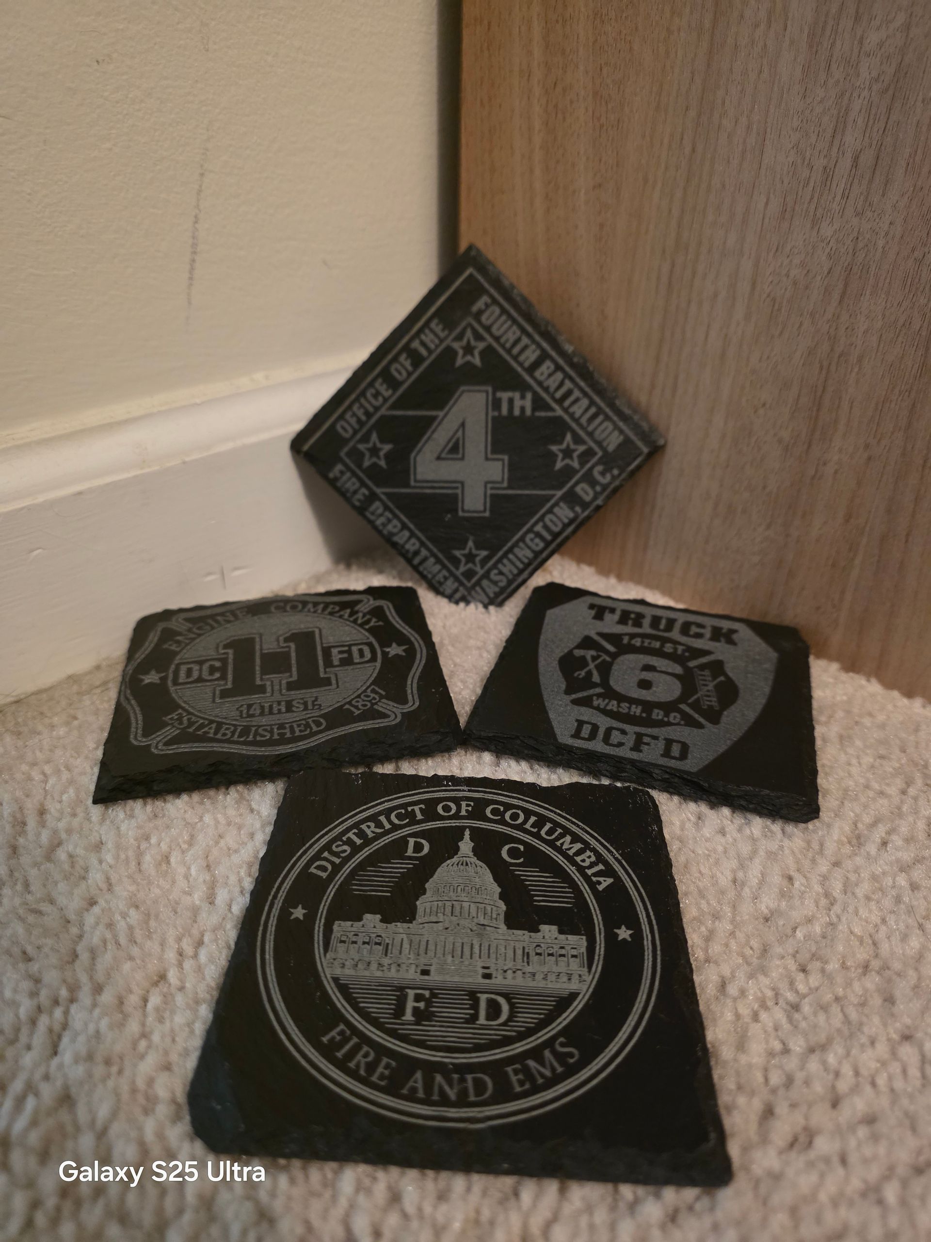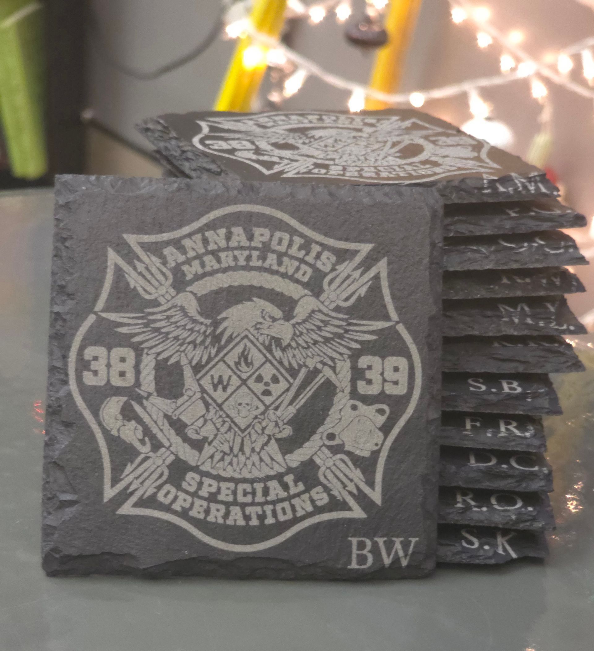 Our personalized slate coasters combine natural stone with precision laser engraving for a bold, long-lasting design. Each coaster features a unique slate texture, making every set one of a kind. Perfect for home bars, gifts, or branded pieces, these coasters add a rugged yet refined touch to any space.